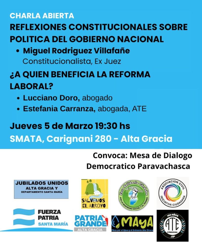 El jueves 5 de marzo, a las 19.30, en el local de SMATA (Dino Carignani 280) se llevará adelante una charla abierta en la cual el abogado constitucionalista Miguel Rodríguez Villafañe compartirá «Reflexiones constitucionales sobre política del Gobierno Nacional» y los abogados laboralistas Luciano Doró y Estefanía Carranza dialogarán respecto a la pregunta «¿A quién beneficia la reforma laboral?». La actividad, abierta a todo público, es organizada por la Mesa de Diálogo Democrático de Paravachasca.