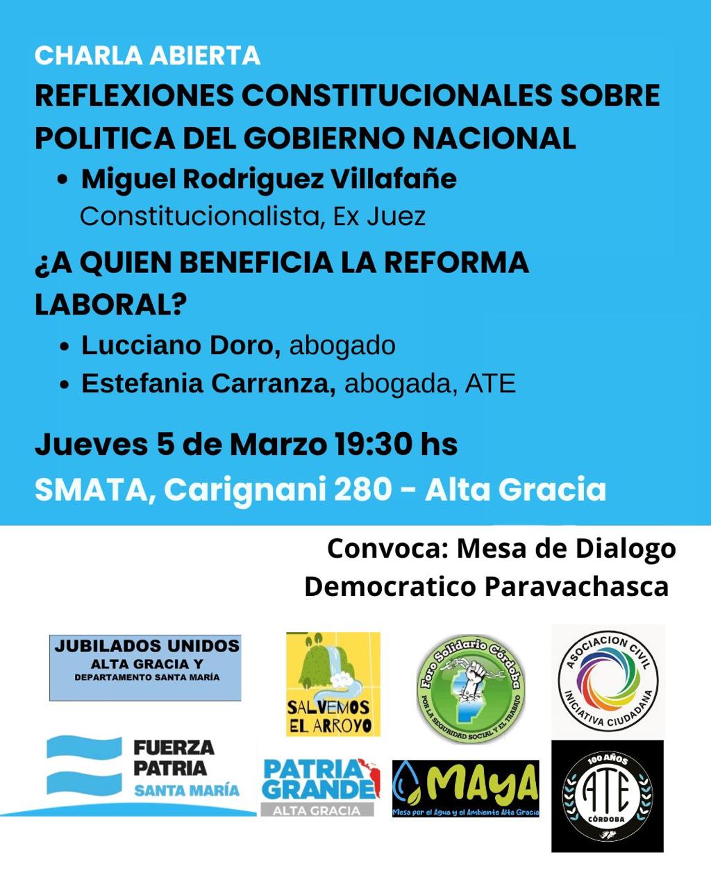 El jueves 5 de marzo, a las 19.30, en el local de SMATA (Dino Carignani 280) se llevará adelante una charla abierta en la cual el abogado constitucionalista Miguel Rodríguez Villafañe compartirá «Reflexiones constitucionales sobre política del Gobierno Nacional» y los abogados laboralistas Luciano Doró y Estefanía Carranza dialogarán respecto a la pregunta «¿A quién beneficia la reforma laboral?». La actividad, abierta a todo público, es organizada por la Mesa de Diálogo Democrático de Paravachasca.
