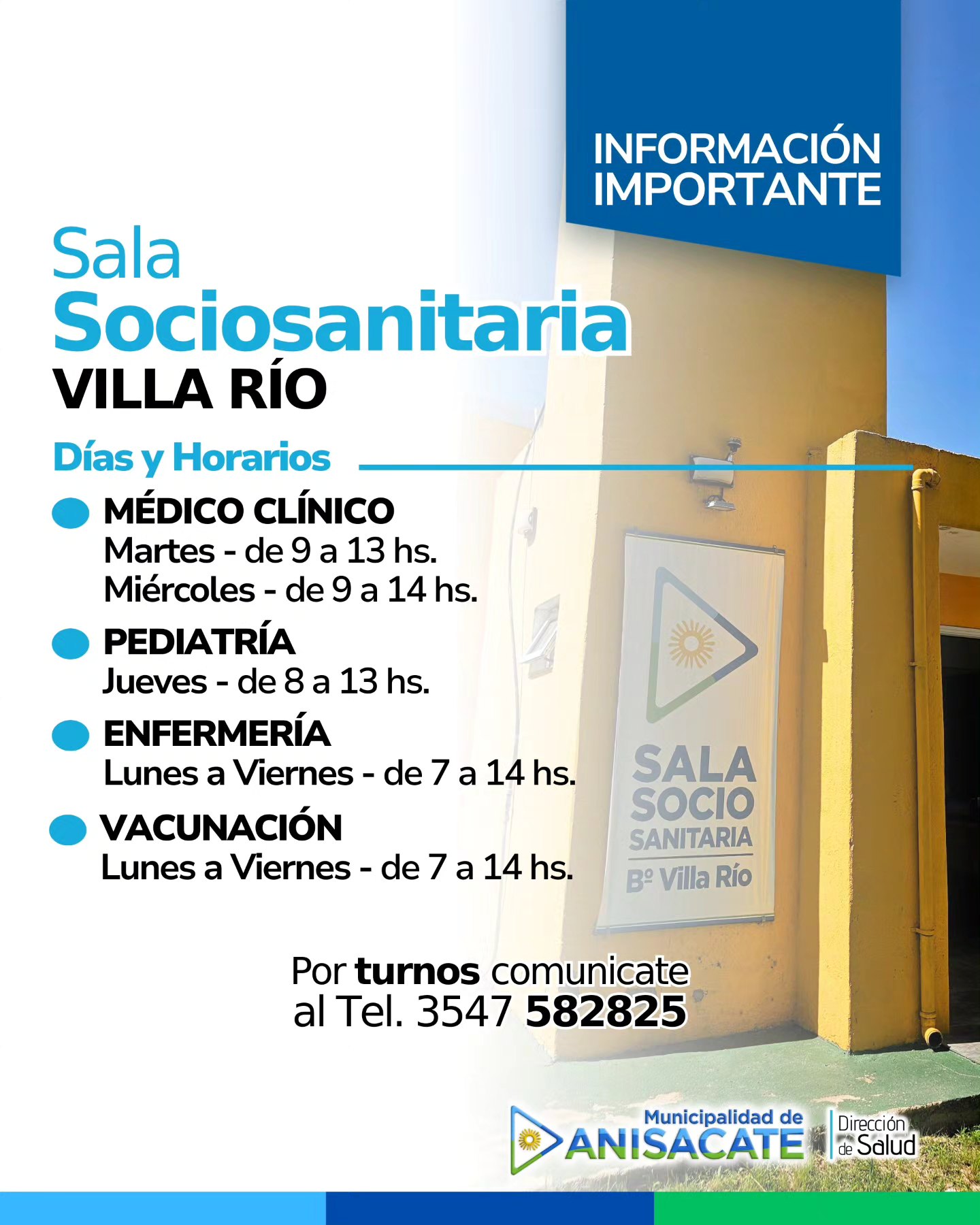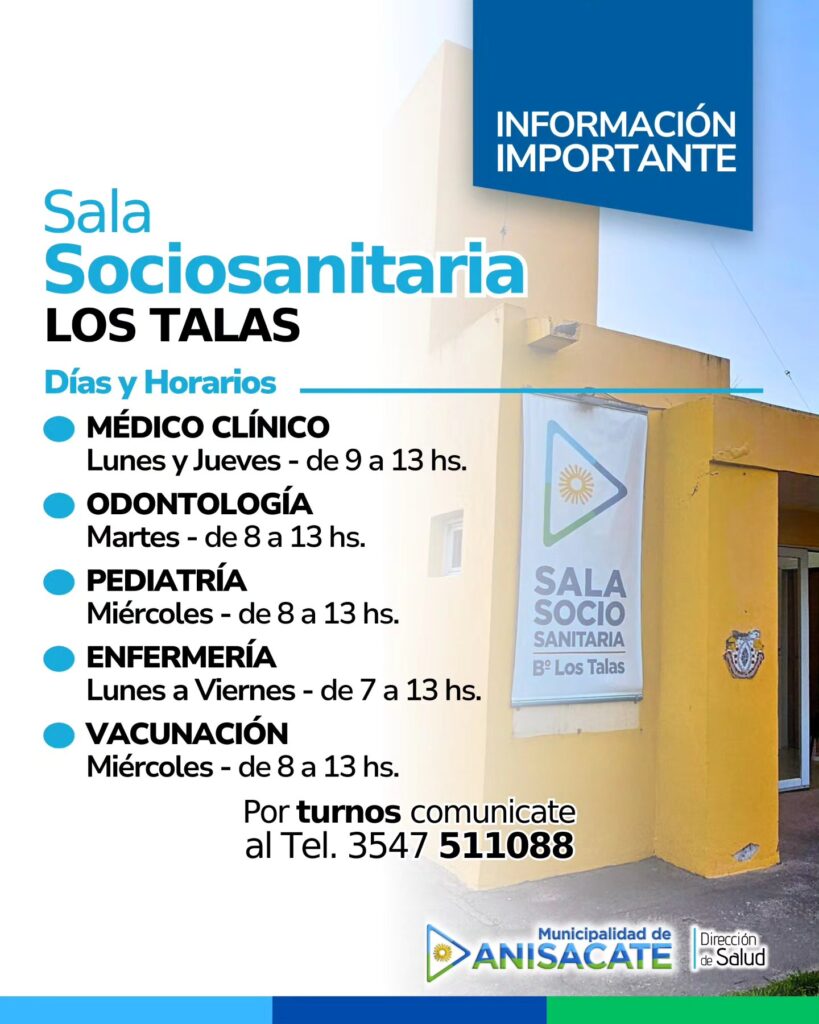 La Municipalidad de Anisacate dio a conocer las vías de contacto de los dos dispensarios municipales y de las salas sociosanitarias de Villa Río y Los Talas, y detalló el cronograma de horarios de las diversas especialidades que se prestan. «No postergues tus controles. Ante cualquier duda, comunicate con nosotros», expresaron oficialmente.