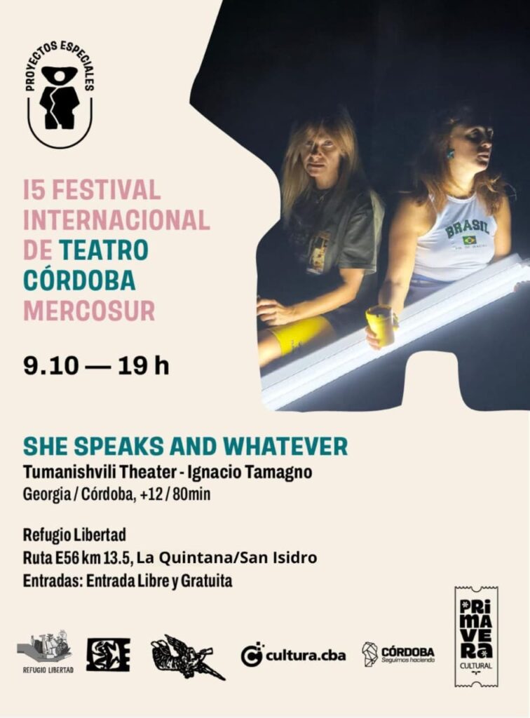 Entre el jueves 9 y el sábado 11 de octubre, cuatro obras que forman parte del “Festival Internacional de Teatro Córdoba Mercosur”, que se desarrolla en la provincia, se presentarán en el Valle de Paravachasca. La coproducción georgiana argentina “She Speaks and Whatever” será montada en el Refugio Libertad; la peruana “Desde el azul”, en el Centro Cultural Espacio Abierto; “Reina en el Gondo” de Buenos Aires, en Cañito Cultural; y la cordobesa “Desencajadas S.C.I.”, en el espacio comunitario Villa Ríe.