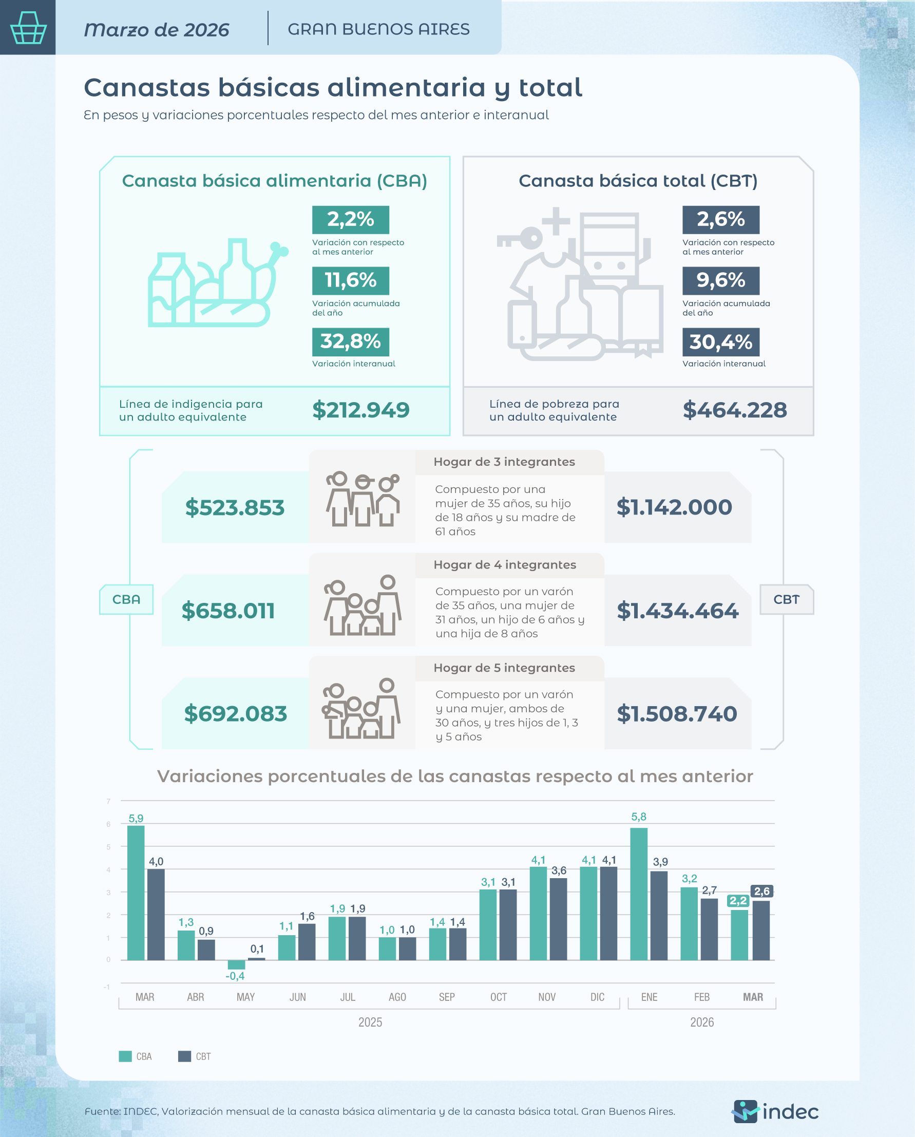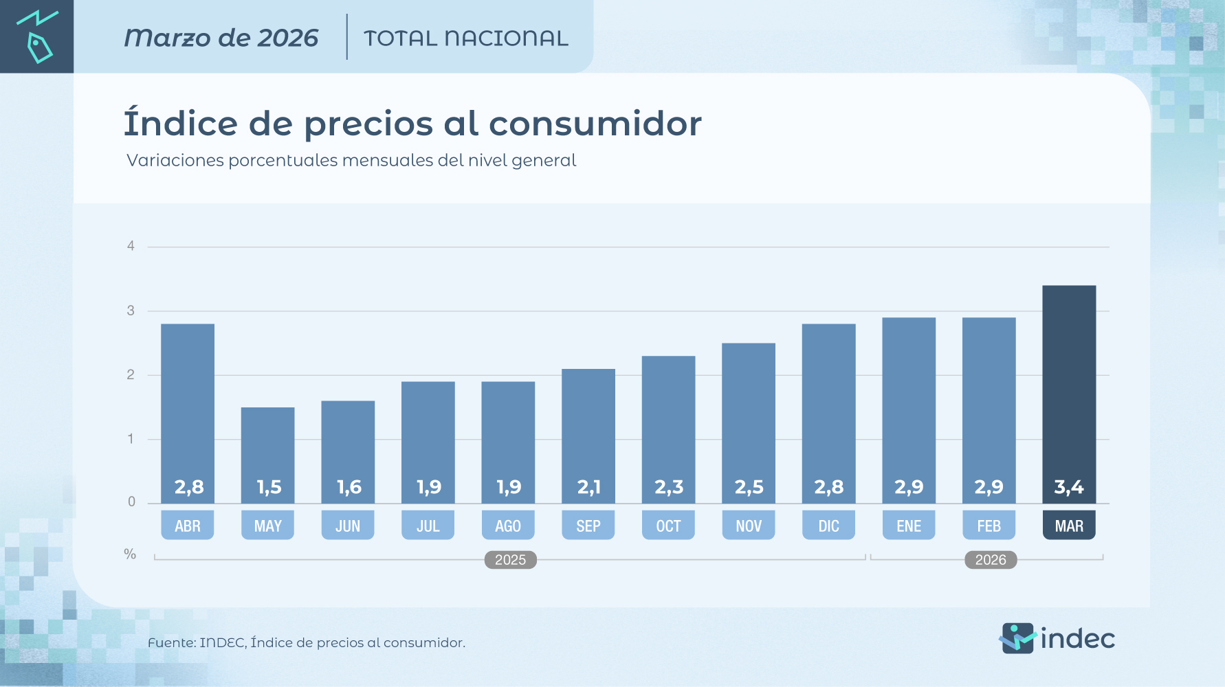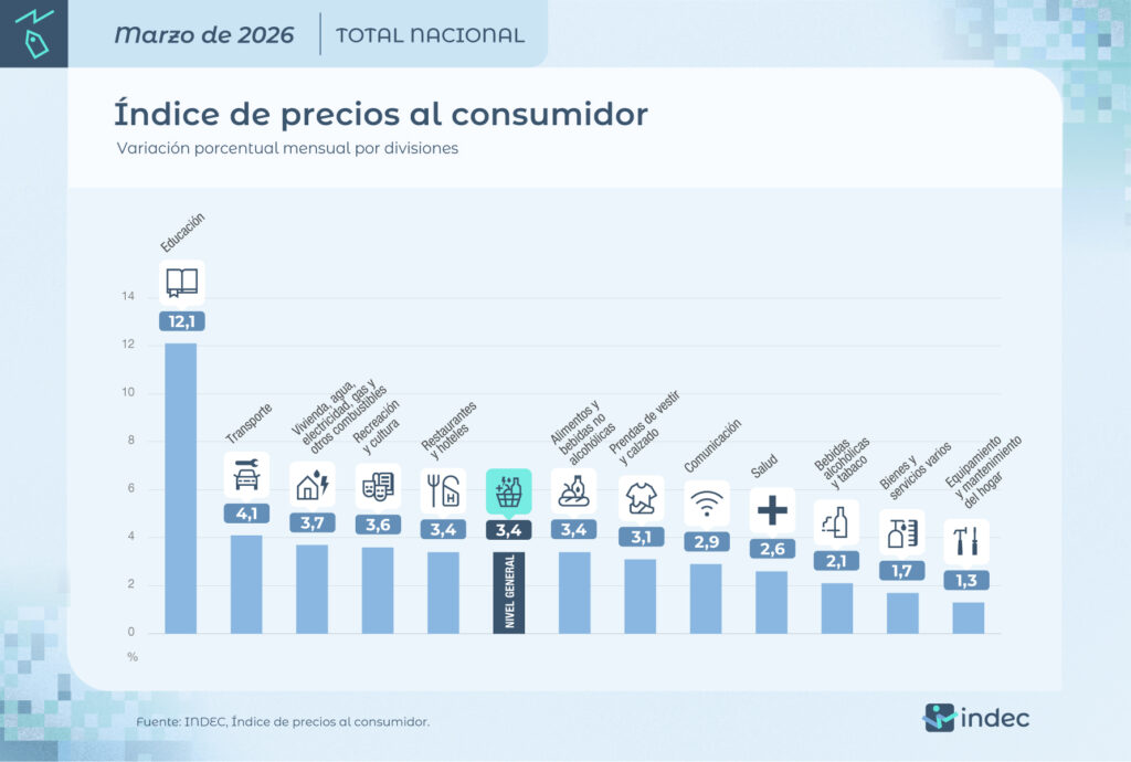 El Instituto Nacional de Estadísticas y Censos (Indec) informó que el Nivel general del Índice de precios al consumidor (IPC) registró un alza mensual de 3,4% en marzo, acumulando una variación del 9,4% en lo que va del año y un alza del 32,6% respecto al mismo mes de 2025. Se trata del alza mensual más alto del último año. Paralelamente, informó el organismo que una familia necesitó $1.434.464 para no ser pobre y $658.011 para no ser indigente.
