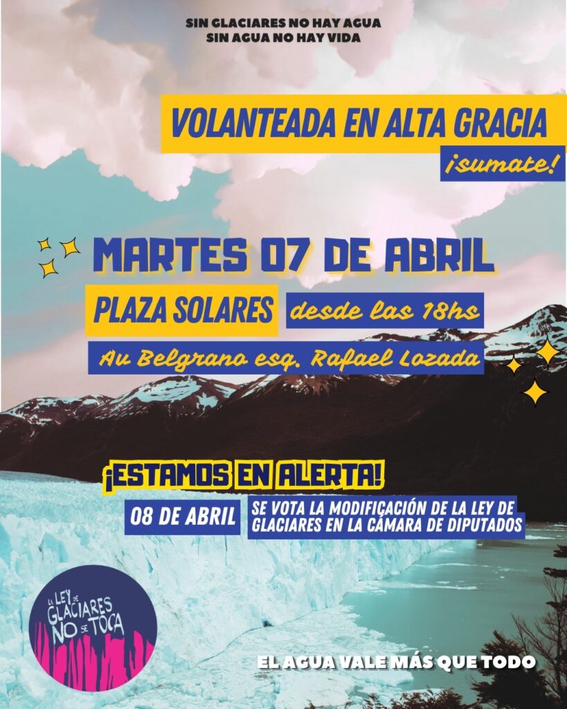 La actividad en Alta Gracia, en tanto, también convocada por vecinas y vecinos autoconvocados y diversas organizaciones, consistirá en una volanteada en la esquina de Avenida Belgrano y Rafael Lozada. «Traé tu cartel y vení a volantear. Sumate a defender el agua y los glaciares. Es ahora«, expresa la convocatoria, orientada a la comunidad del Valle de Paravachasca.