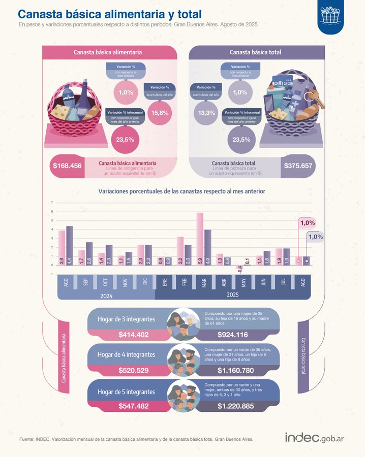 En tanto, en agosto la variación mensual tanto de la canasta básica alimentaria (CBA), que determina el umbral para no caer en la indigencia, como de la canasta básica total (CBT), debajo del cual una familia se encuentra en la pobreza, fue de 1,0%.