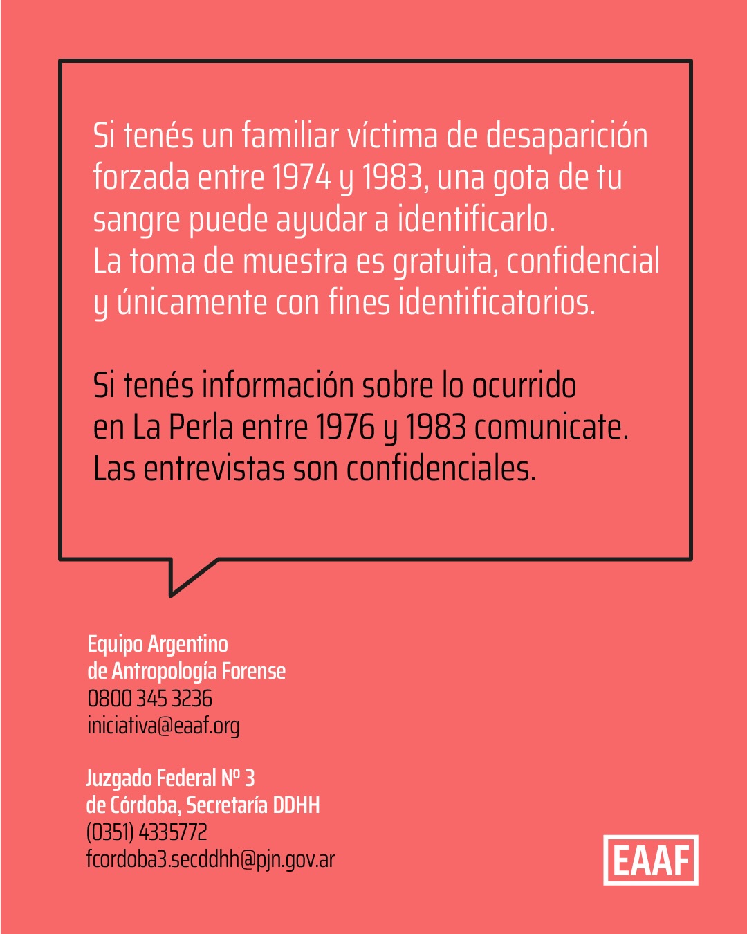 «Si tenés un familiar víctima de desaparición forzada entre 1974 y 1983, una gota de tu sangre puede ayudar a identificarlo. La toma de muestra es gratuita, confidencial y únicamente con fines identificatorios», expresan desde el EAAF; y convocan también a prestar testimonio a aquellas personas que tengan información sobre lo ocurrido en La Perla entre 1976 y 1983, destacando que las entrevistas son confidenciales.