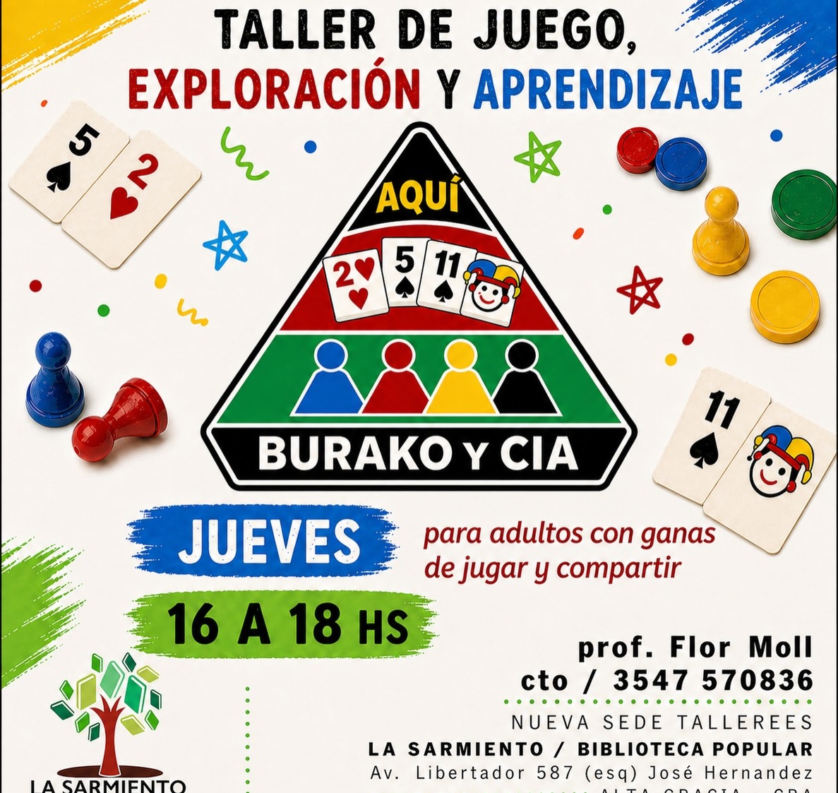 Taller de Juego, Exploración y Aprendizaje para adultos con ganas de jugar y compartir. Jueves de 16 a 18. Profesora: Flor Moll. Contacto: 3547570836