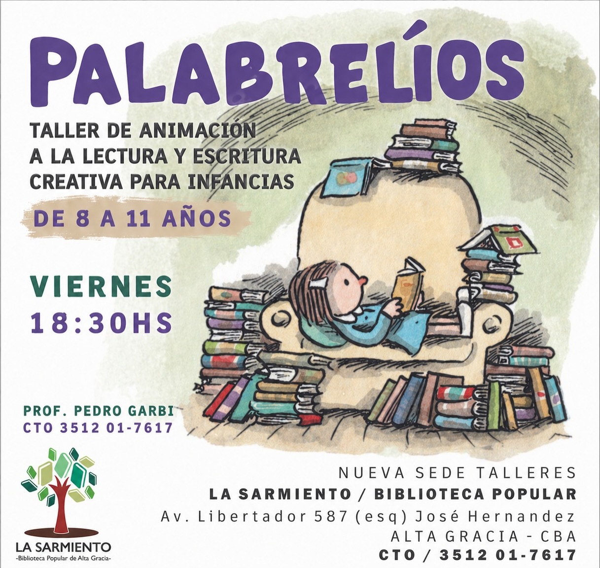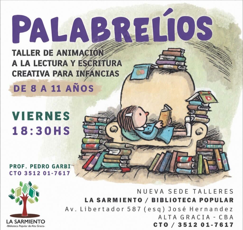 Palabrelíos: taller de animación a la lectura y escritura creativa para infancias. De 8 a 11 años. Viernes a las 18.30. Profesor: Pedro Garbi. Contacto: 3512017617.