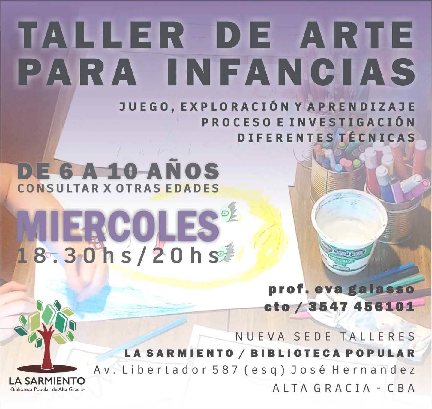 Taller de Arte para Infancias: juego, exploración y aprendizaje; proceso e investigación de diferentes técnicas. De 6 a 10 años. Miércoles de 18.30 a 20. Profesora: Eva Galasso. Contacto: 3547456101.