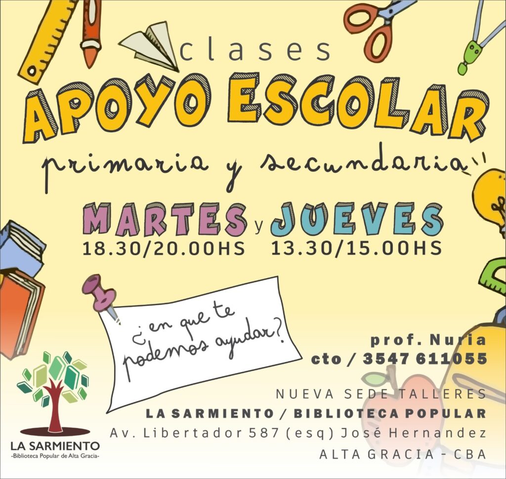 Clases de apoyo escolar – primaria y secundaria: Martes de 18.30 a 20 y Jueves de 13.30 a 15. Profesora: Nuria. Contacto: 3547611055.