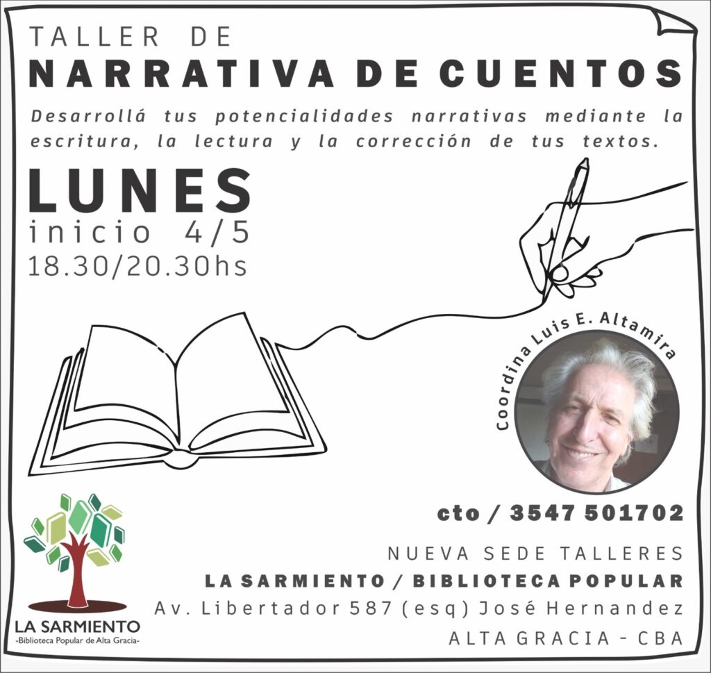Taller de Narrativa de Cuentos: Lunes de 18.30 a 20.30. Inicia el 4 de mayo. Coordina: Luis Altamira. Contacto: 3547501702.