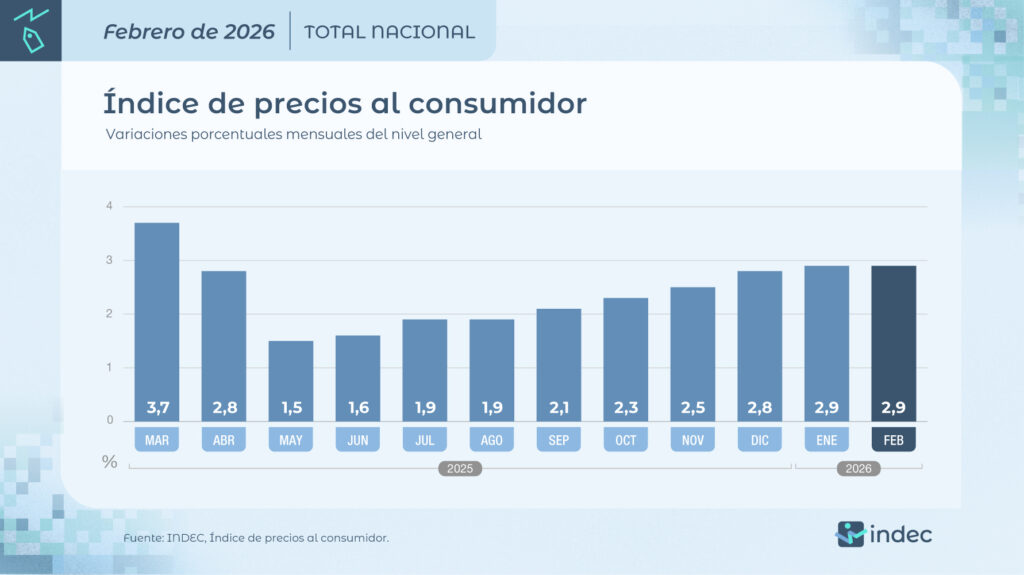 El Instituto Nacional de Estadísticas y Censos (Indec) informó este jueves que la inflación de febrero fue de 2,9% (el mismo número que había dado en enero) y de esta manera se sostuvo en la misma tendencia ascendente que transita desde mayo de 2025. Alimentos y bebidas no alcohólicas se incrementó un 3,3%, por encima del promedio. Paralelamente, reveló que la canasta básica alimentaria (CBA), que establece el umbral debajo del cual una familia cae en la indigencia, se ubicó en los $644.088; mientras que para ser pobre un grupo familiar de cuatro miembros requirió $1.397.672.