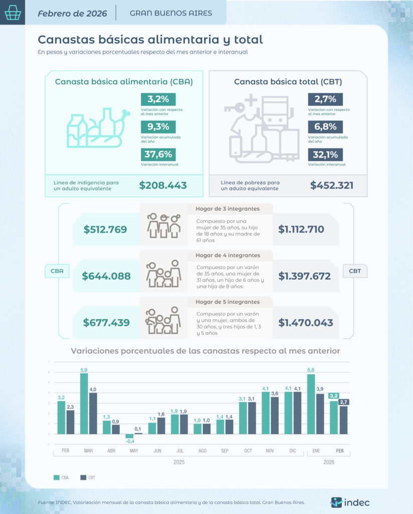 Respecto al valor de las canastas, expuso el organiso: «Durante febrero de 2026, la variación mensual de la canasta básica alimentaria (CBA) fue de 3,2% mientras que la de la canasta básica total (CBT) fue de 2,7%. La CBA y la CBT registraron variaciones interanuales de 37,6% y de 32,1%, respectivamente».