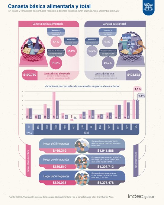 El Instituto Nacional de Estadísticas y Censos (Indec) dio a conocer este martes 13 de enero que la inflación de diciembre de 2025 fue del 2,8%, el número más alto de los últimos ocho meses, que igualó al dato de abril. Incluso, por encima de ese número, el organismo también reveló un incremento del 4,1% mensual en las canastas básicas alimentaria y total que, respectivamente, representan el umbral debajo del cual una familia cae en la indigencia y la pobreza.
