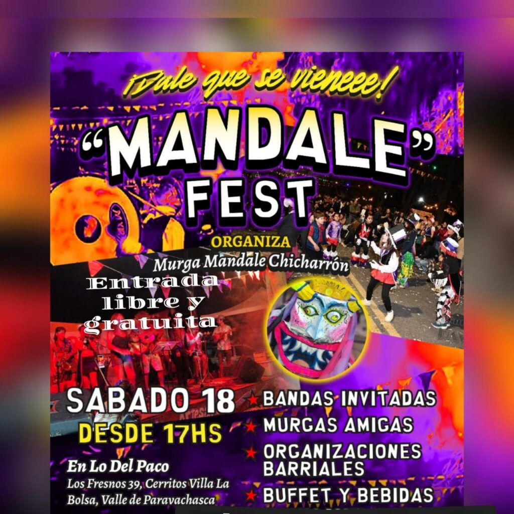 Este sábado 18 de octubre, desde las 17, se llevará adelante en «Lo de Paco», Villa La Bolsa, el «Mandale Fest», que organiza la murga Mandale Chicharrón y que contará con bandas invitadas, murgas amigas, organizaciones barriales, buffet y bebidas. Se trata de un evento con entrada libre y gratuita.