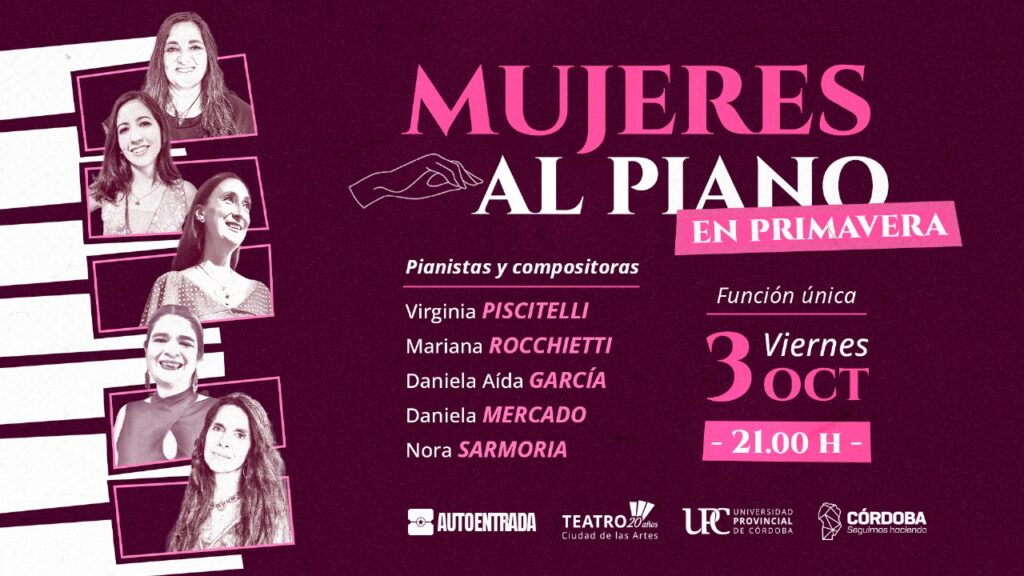 Este viernes 3 de octubre, a las 21, en el Teatro Ciudad de las Artes de la capital cordobesa se presenta el concierto «Mujeres al Piano en Primavera», que reúne a cinco destacadas pianistas argentinas: Daniela Mercado, Nora Sarmoria, Virginia Piscitelli, Daniela García y Mariana Rocchietti. El concierto incluye composiciones propias de las intérpretes, estrenos y arreglos especialmente creados para la ocasión, así como obras del repertorio universal.