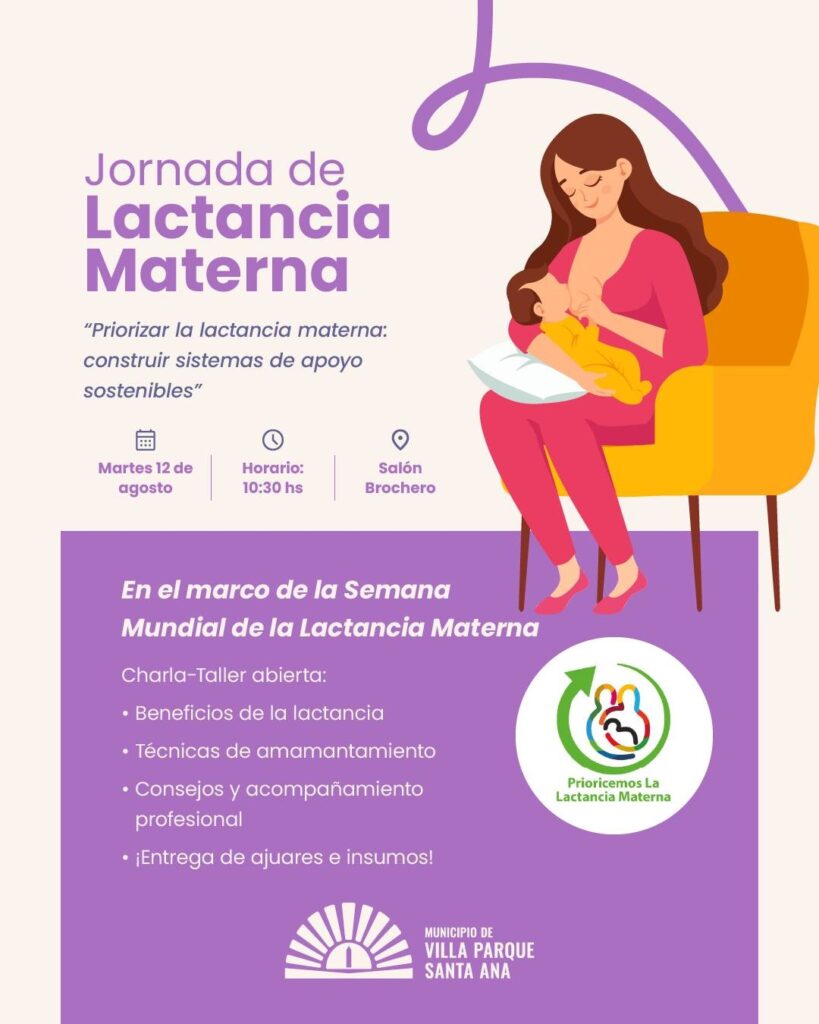 El martes 12 de agosto, a las 10.30, se llevará adelante en el Salón Brochero de Villa Parque Santa Ana una «Jornada de Lactancia Materna», que en el marco de la conmemoración internacional, estará orientada a «construir sistemas de apoyo sostenibles», en consonancia con el lema de la “Semana de la Lactancia Materna” a nivel global, que es impulsada por la Organización Mundial de la Salud (OMS) y el Fondo de las Naciones Unidas para la Infancia (UNICEF).