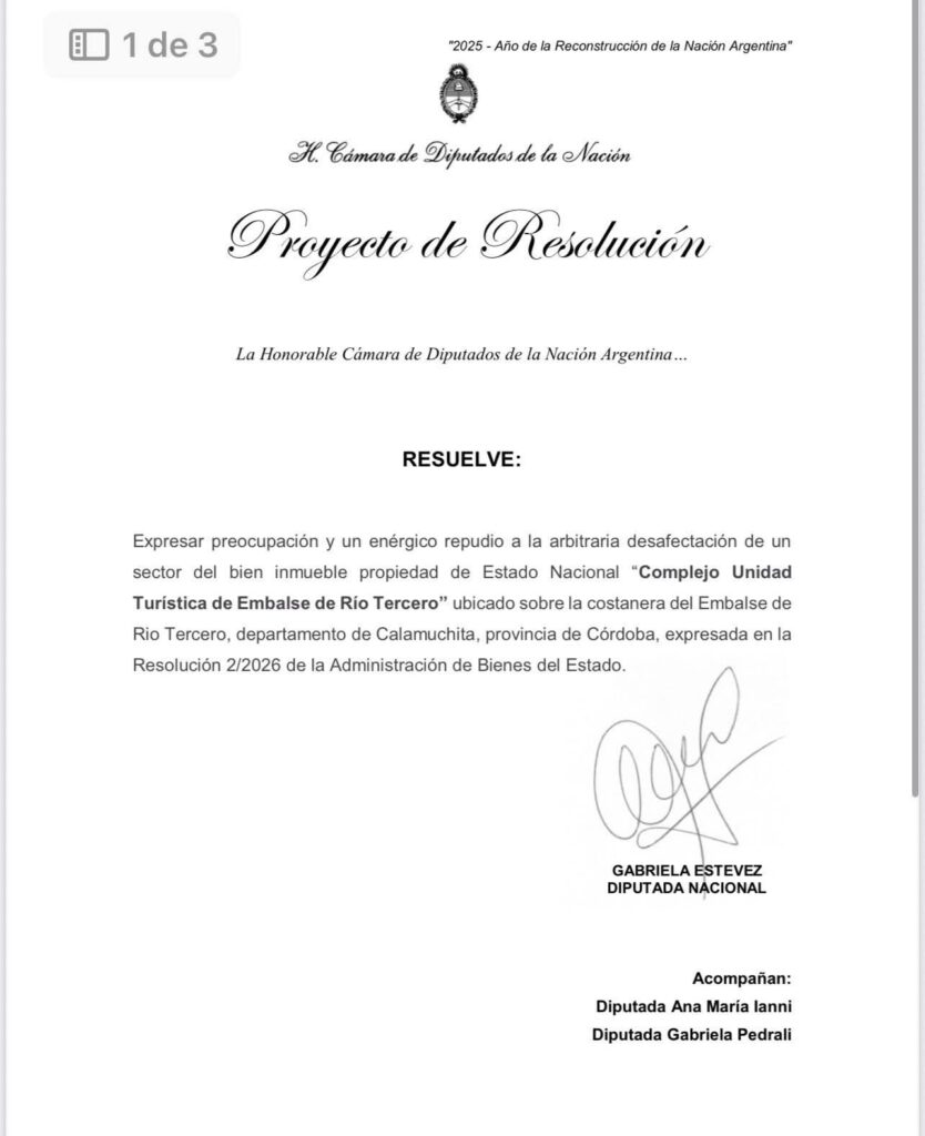 La diputada nacional cordobesa Gabriela Estévez (Unión por la Patria) expresó su repudio y preocupación respecto de la «arbitraria desafectación» del Estado de un sector del Complejo Unidad Turística de Embalse Río Tercero, formalizada a través de la Resolución 2/2026 de la Agencia de Administración de Bienes del Estado (AABE).