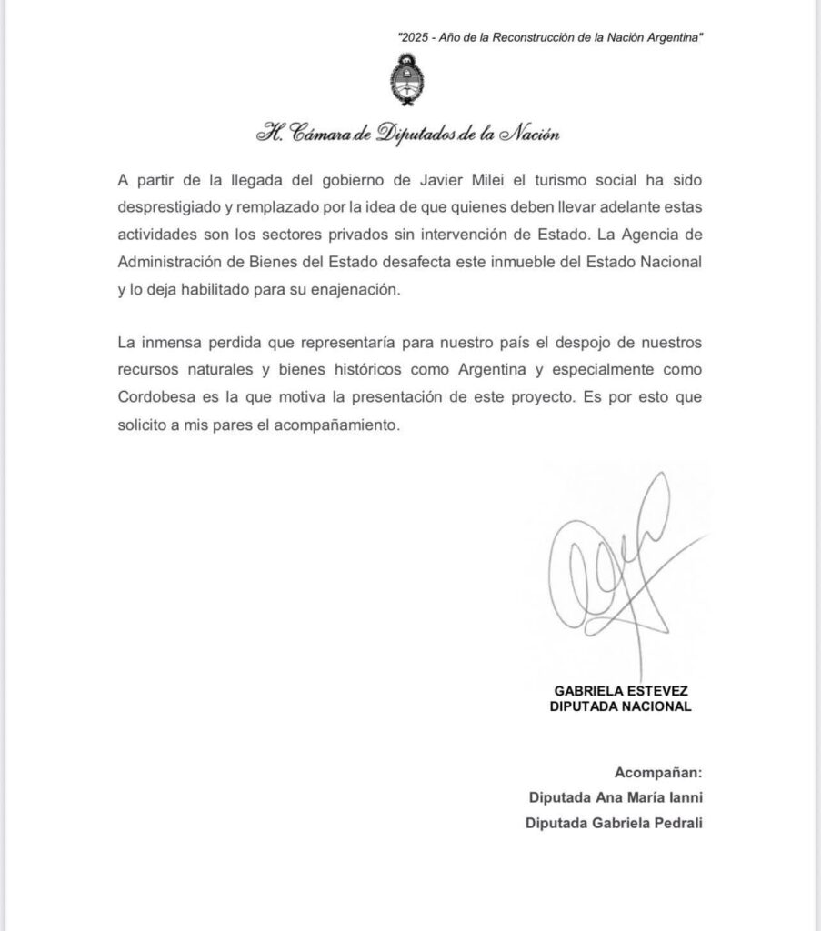 En los fundamentos del proyecto, alude Estévez a la importancia de este complejo turístico ubicado en un predio de 654 hectáreas, con siete hoteles y 51 bungalows; que, desde su inauguración en 1947 y 1951, durante las primeras presidencias de Juan Domingo Perón, ha sido un emblema del turismo social en la Argentina.
