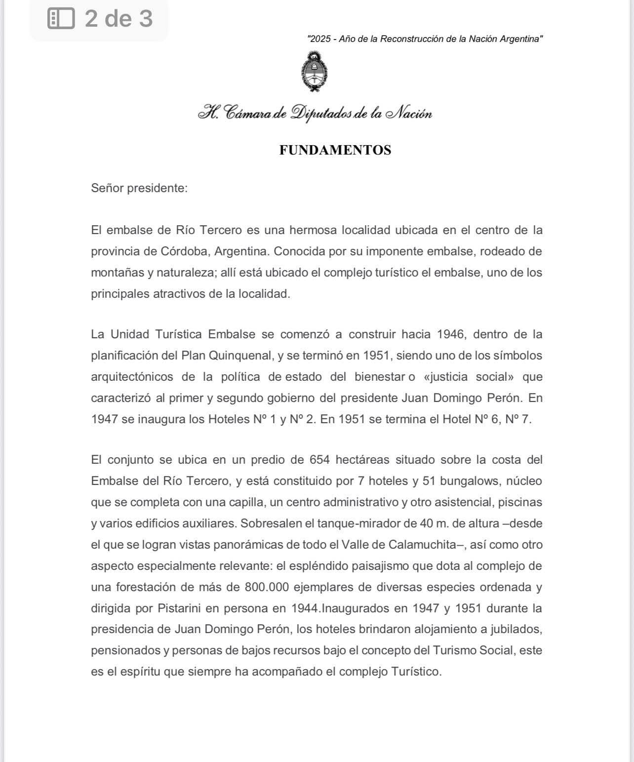 En los fundamentos del proyecto, alude Estévez a la importancia de este complejo turístico ubicado en un predio de 654 hectáreas, con siete hoteles y 51 bungalows; que, desde su inauguración en 1947 y 1951, durante las primeras presidencias de Juan Domingo Perón, ha sido un emblema del turismo social en la Argentina.